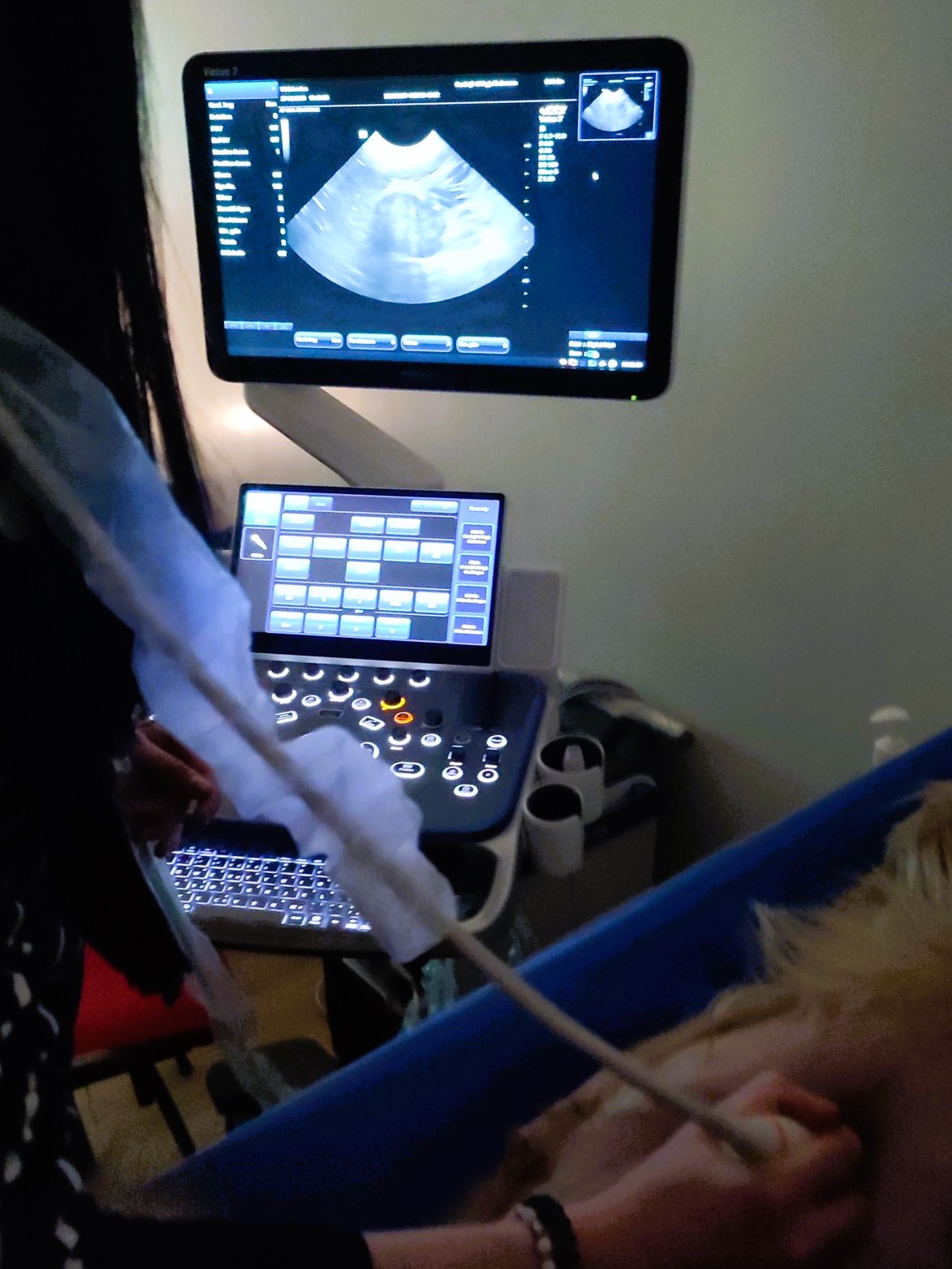 Le formateur réalise une démonstration en direct sur animal, illustrant la méthodologie d’exploration échographique et l’aspect normal de l’organe. -
