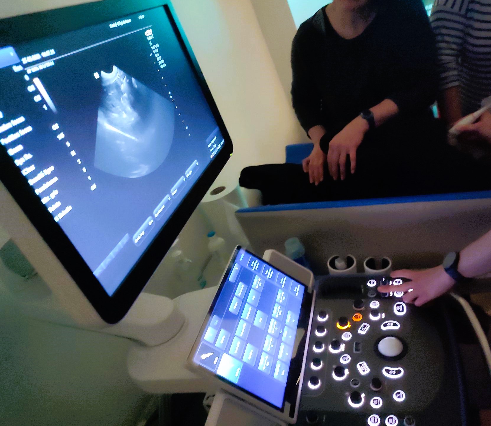 Les participant(e)s s’exercent immédiatement après la démonstration, en ateliers de 2 à 3 personnes par échographe, afin de consolider leurs acquis. -