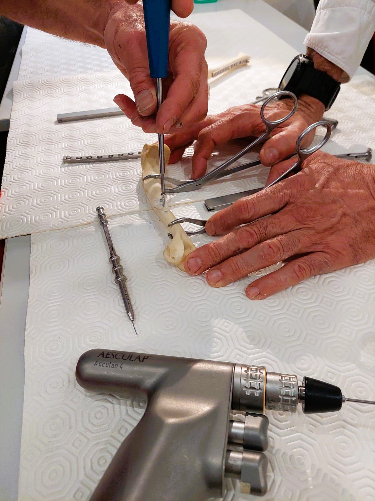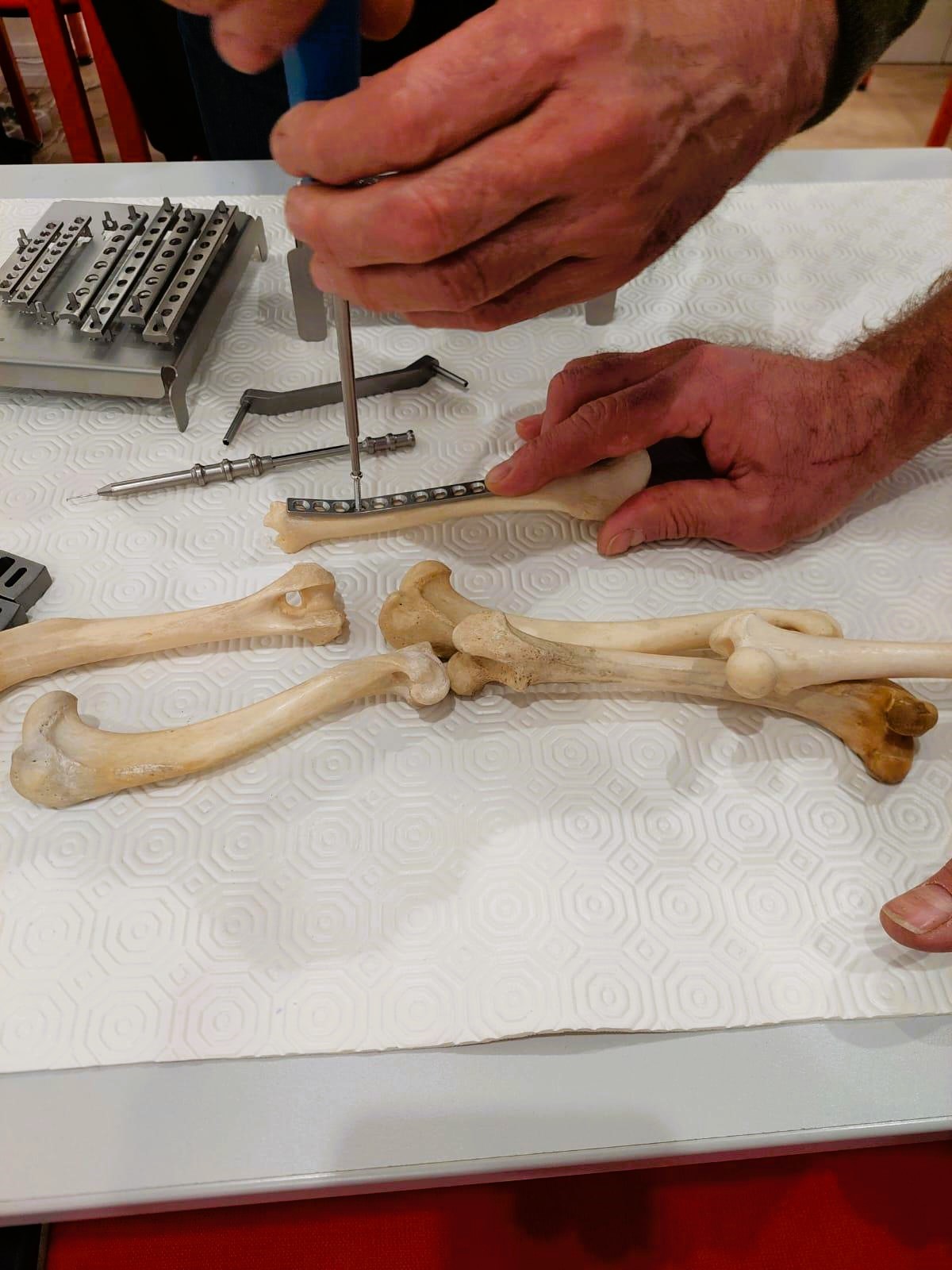 - Pratique guidée des interventions chirurgicales : démonstration par le formateur puis réalisation individuelle de chaque geste technique sur os sec